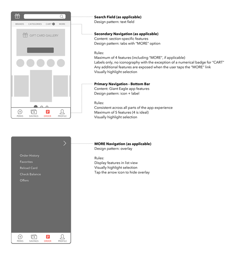 Gift Cards Gallery is part of the eCommerce experience of the app, so we made recommendations on where to promote the feature, wayfinding and access. The feature had it’s own custom navigation, search/browse and cart functionality. We created templates for the Order landing page and promotion for the feature, a Gift Gard-branded header with search input field and cart link, secondary navigation bar and menu overlays, a landing page, product detail page, and Order Confirmation page.